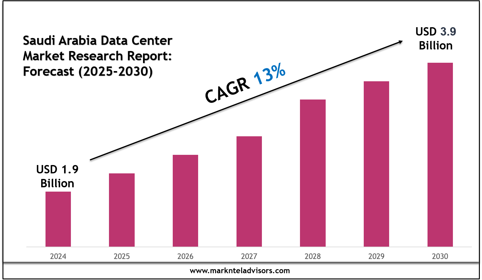 The Saudi Arabia Data Center Market size was valued at around USD 1.9 billion in 2024 and is projected to reach USD 3.9 billion by 2030. Along with this, the market is estimated to grow at a CAGR of around 13% during the forecast period, i.e., 2025-30.