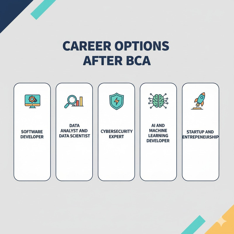 BCA के बाद छात्रों के पास कई करियर विकल्प होते हैं। यह केवल नौकरी पाने तक ही सीमित नहीं है, बल्कि इसके माध्यम से छात्र अपना खुद का व्यवसाय या स्टार्टअप भी शुरू कर सकते हैं।