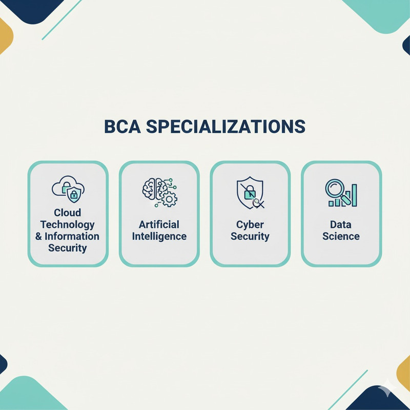 BCA सिर्फ सामान्य कंप्यूटर एप्लीकेशंस तक ही सीमित नहीं है। इसमें विभिन्न आधुनिक तकनीकों में विशेषज्ञता प्राप्त की जा सकती है। ये हैं मुख्य स्पेशलाइजेशन: