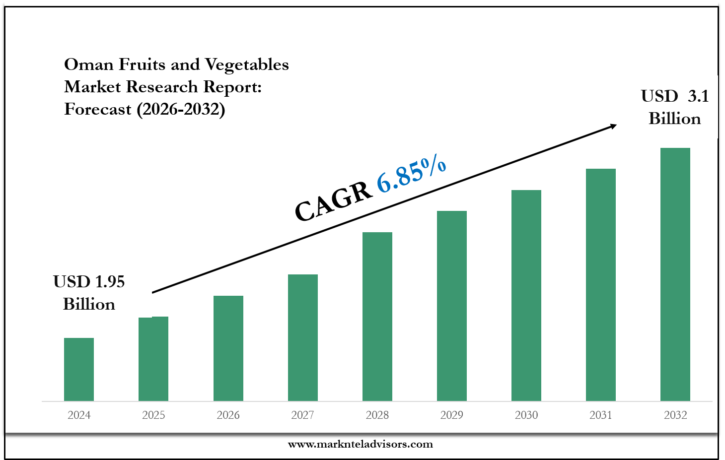 The Oman Fruits and Vegetables Market size was valued at around USD 1.95 billion in 2024 and is projected to reach USD 3.1 billion by 2032. Along with this, the market is estimated to grow at a CAGR of around 6.85% during the forecast period, i.e., 2026-32.