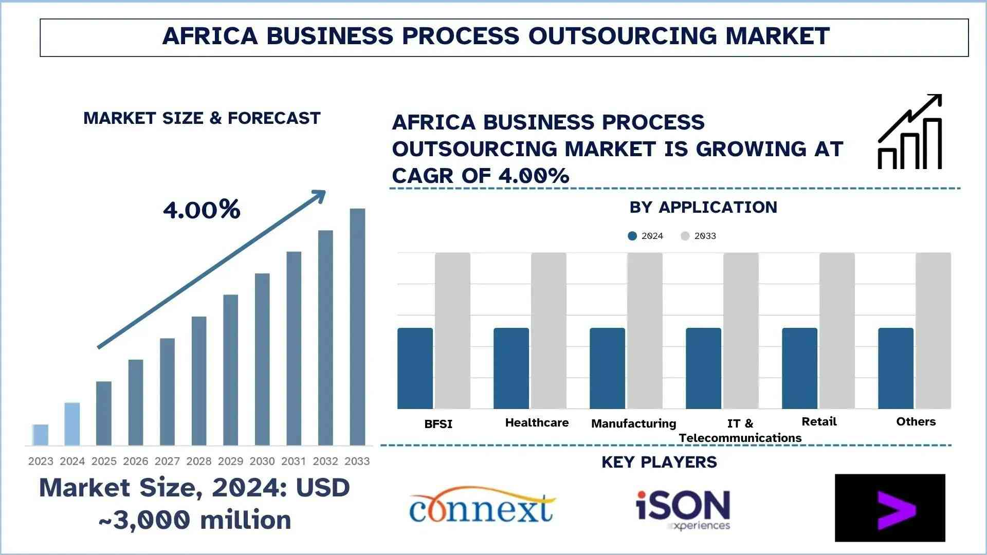 According to UnivDatos, Government Incentives and Policy Support, and Skilled and Cost-Competitive Workforce are some of the key factors supporting the market rise. As per their “Africa Business Process Outsourcing Market” report, the Africa market was valued at USD 3,000 million in 2024, growing at a CAGR of about 4.00% during the forecast period from 2025 - 2033 to reach USD million by 2033.