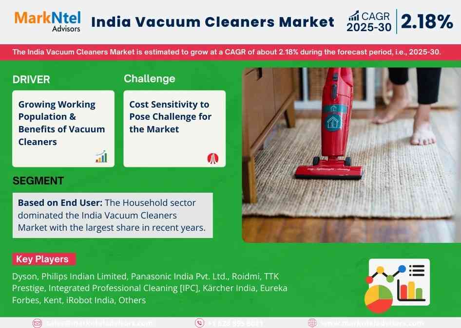 MarkNtel Advisors, a leading market research and consulting firm, has announced the release of its latest study titled India Vacuum Cleaners Market Research Report: Forecast (2025–2030). This report provides a detailed assessment of the India Vacuum Cleaners, covering its evolving dynamics, emerging trends, key growth drivers, major challenges, and competitive landscape.