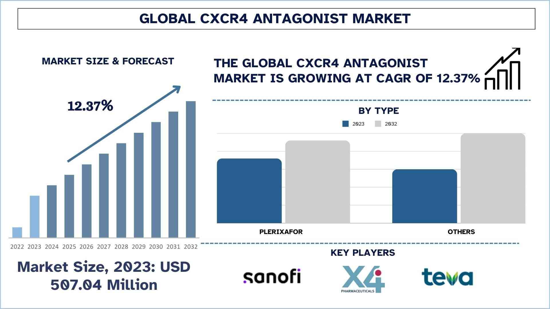 According to the UnivDatos, the rise in prevalence of cancer, and HIV, increasing penetration of CXCR4 antagonists, expansion of combination therapy, and increasing focus towards research and development drive the CXCR4 antagonist market. As per their “CXCR4 antagonists Market” report, the global Market was valued at USD 507.04 million in 2023, growing at a CAGR of about 12.37% during the forecast period from 2024 - 2032 to reach USD million by 2032.