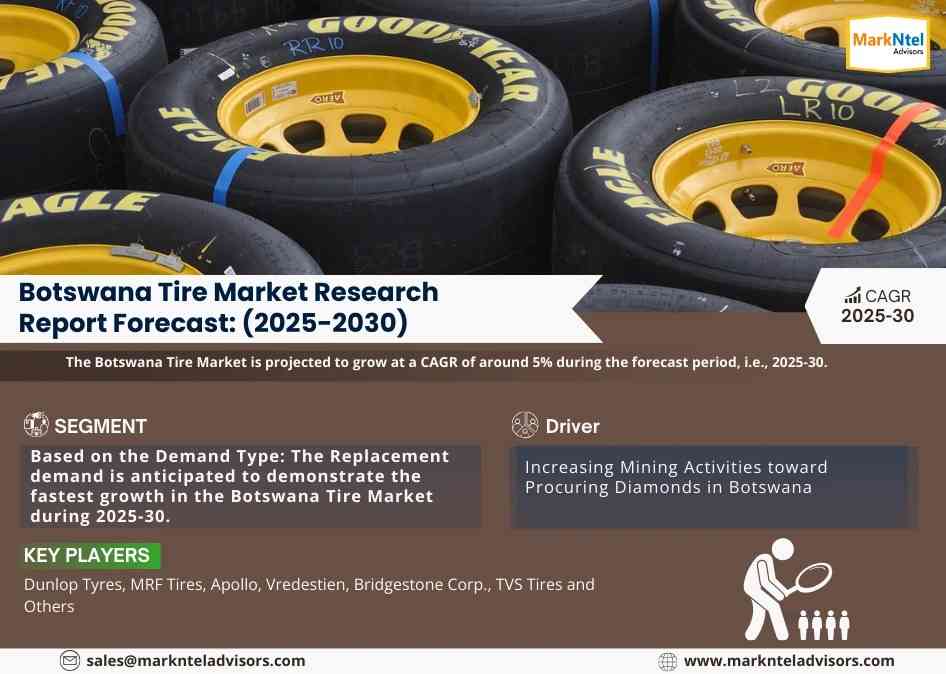 MarkNtel Advisors, a leading market research and consulting firm, has announced the release of its latest study titled Botswana Tire Market Research Report Forecast (2025-2030). This report provides a detailed assessment of the Botswana Tire Market, covering its evolving dynamics, emerging trends, key growth drivers, major challenges, and competitive landscape.