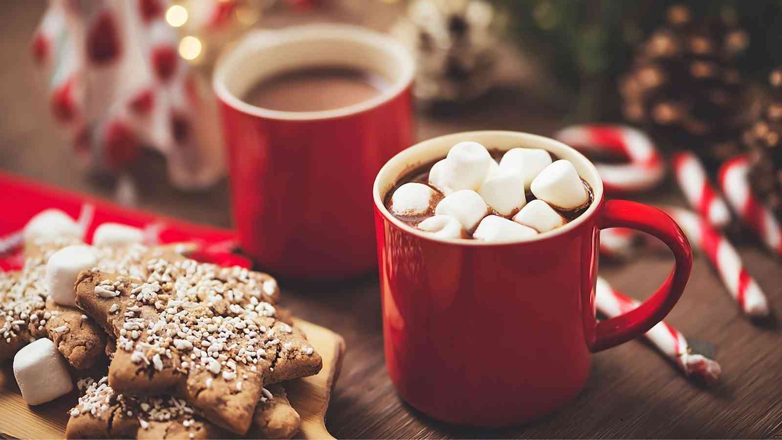 The menu includes classic, peppermint, white chocolate, and Mexican-style cocoa, plus an artisan toppings bar with marshmallows, whipped cream, caramel, chocolate shavings, and peppermint. Vegan oat milk and other dairy alternatives are available without sacrificing creaminess.