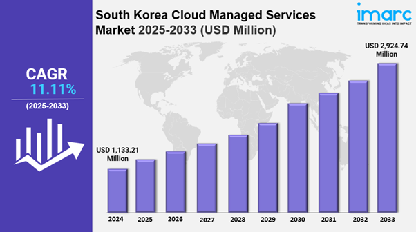 The South Korea cloud managed services market size was valued at USD 1,133.21 Million in 2024. Looking forward, IMARC Group estimates the market to reach USD 2,924.74 Million by 2033, exhibiting a (CAGR) of 11.11% from 2025-2033.