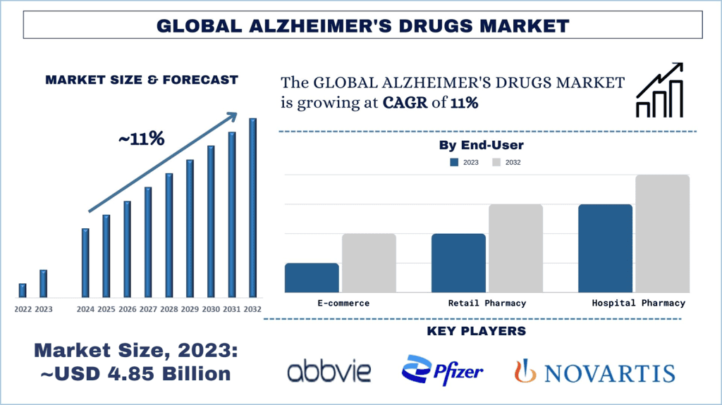 According to the Universal Data Solutions analysis, the high prevalence of Alzheimer's disease, an aging population, and substantial governmental and private funding will drive the scenario of the global Alzheimer’s Drugs and as per their “Alzheimer’s Drugs Market” report, the Market was valued at USD ~4.85 billion in 2023, growing at a CAGR of ~11% during the forecast period from 2024 - 2032 to reach USD billion by 2032.