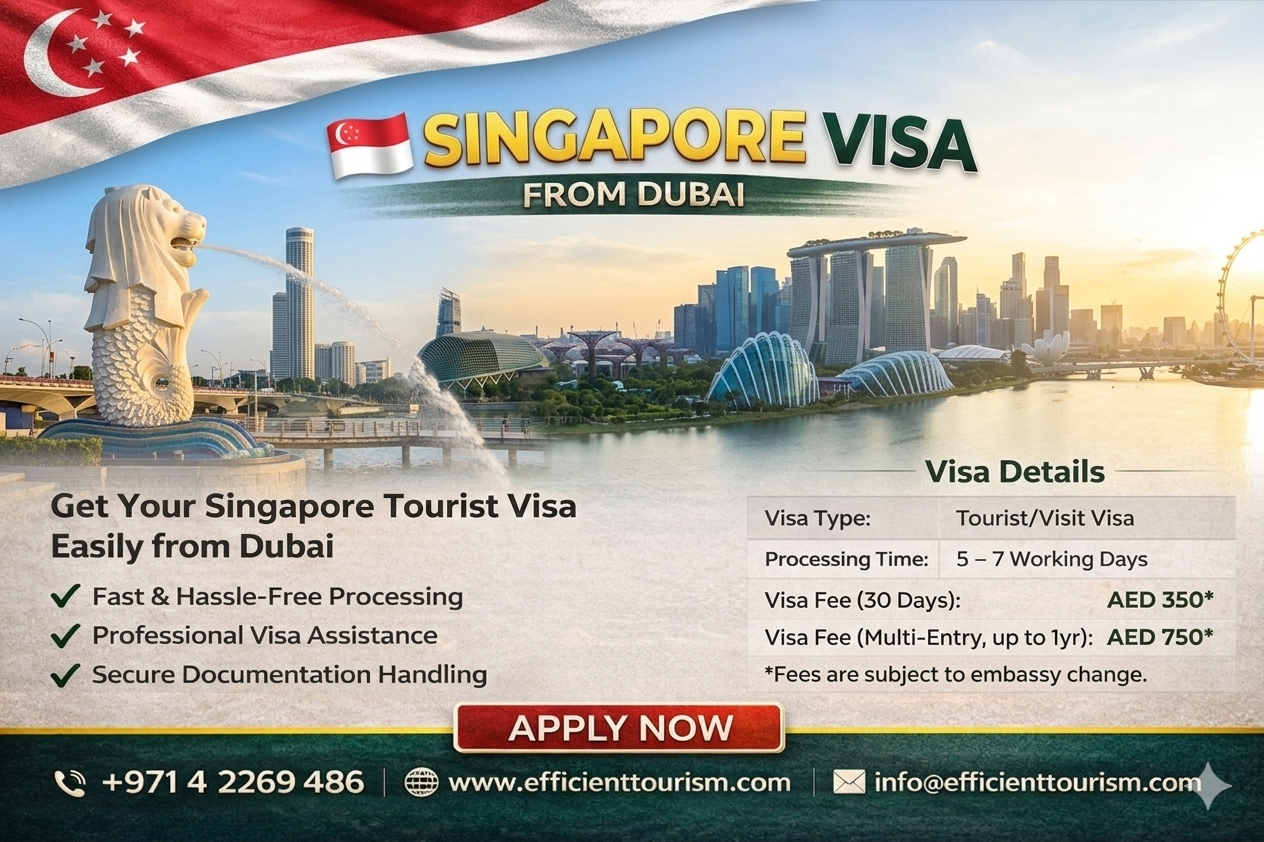 Apply now for your Singapore visa from Dubai easily with EfficientTourism (ET) & enjoy a smooth visa process. Singapore is famous for its modern skyline, amazing attractions & vibrant culture. Most Singapore tourist visas are processed within 3–5 working days after submission.