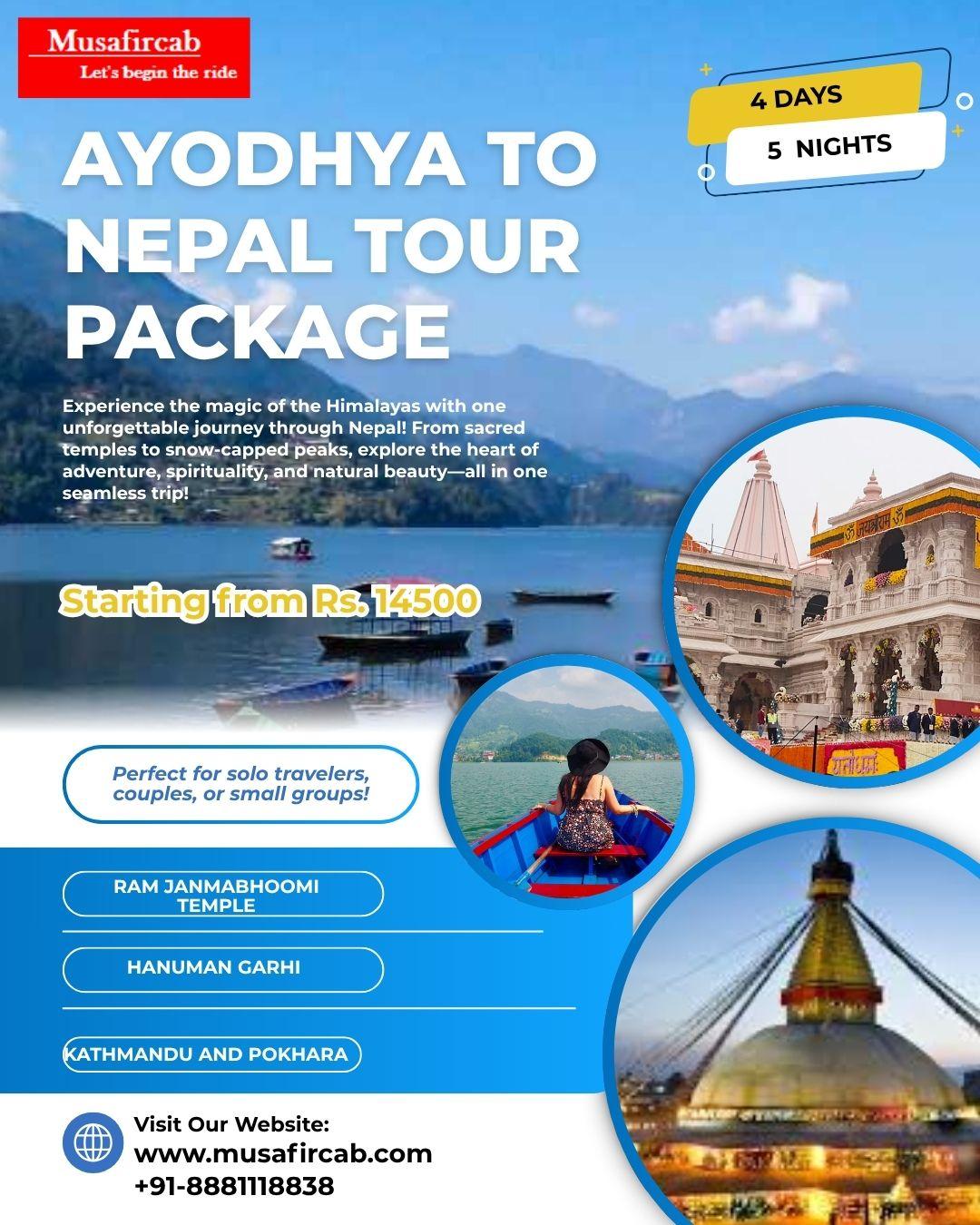 Ayodhya to Nepal Tour Package Begin your spiritual journey from Ayodhya – the birthplace of Lord Ram to Nepal – the divine land of Goddess Sita, with Musafircab as your trusted travel partner. Experience the perfect blend of devotion, culture, and natural beauty as you explore Janakpur, Kathmandu, Pokhara, and Muktinath in complete comfort. Whether you’re traveling solo, with family, or in a group, we ensure a smooth, safe, and memorable journey. ✅ Our Services Include: 🚖 AC Cabs, SUVs & Tempo Travellers with skilled drivers 🏨 Comfortable hotel stays in Kathmandu & Pokhara 🍽️ Delicious meals and local sightseeing 🎯 Customized itineraries and tour assistance Book your Ayodhya to Nepal Tour Package today and make your journey divine with Musafircab! 📞 Call now at +91-8881118838 Visit: https://www.musafircab.com/page/ayodhya-to-nepal-tour-package