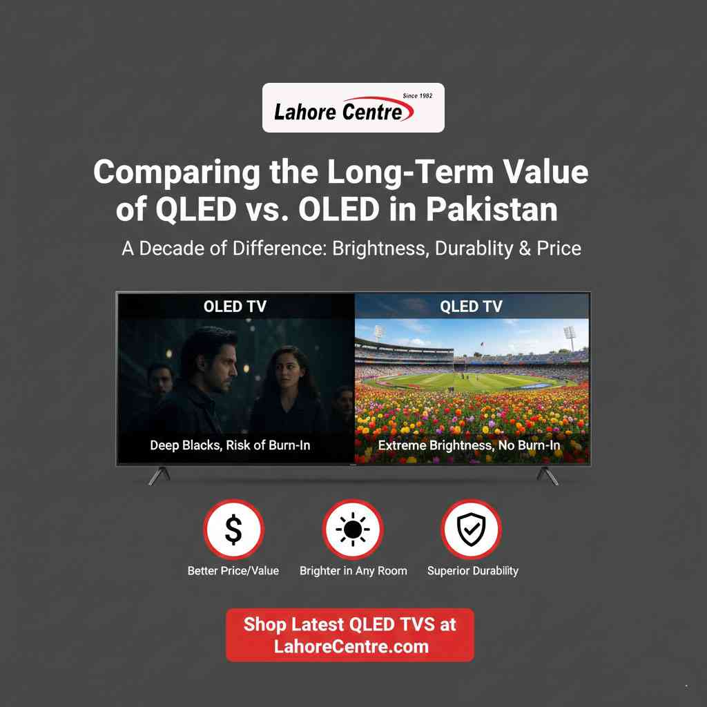 Compare QLED vs. OLED for long-term value in Pakistan. Discover durability, performance, and price insights for your next TV at Lahore Centre.